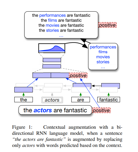- Contextual augmentation is a domain-independent data augmentation for text classification tasks. Texts in the supervised dataset are augmented by replacing words with other words which are predicted by a label-conditioned bi-directional language model.