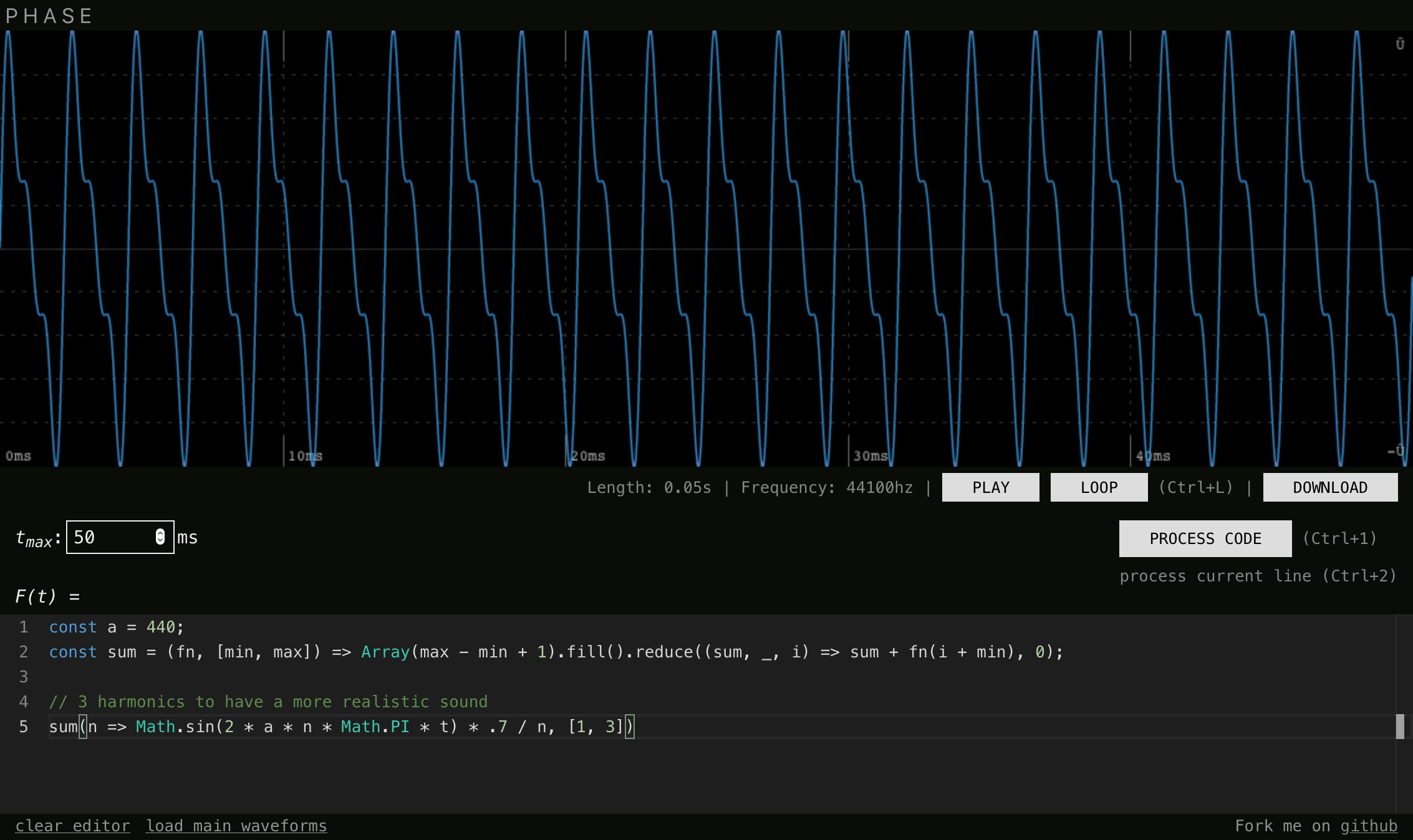sum(n => Math.sin(2 * a * n * Math.PI * t) * .7 / n, [1, 3])npm i to install the dependencies