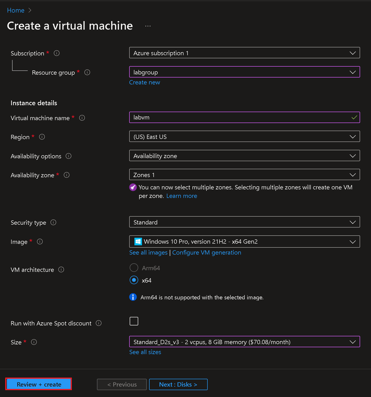 Click Review + create to start the creation of your virtual machine. After selecting to 'Review + Create', you will see a summary of the what has been selected in creating the VM.