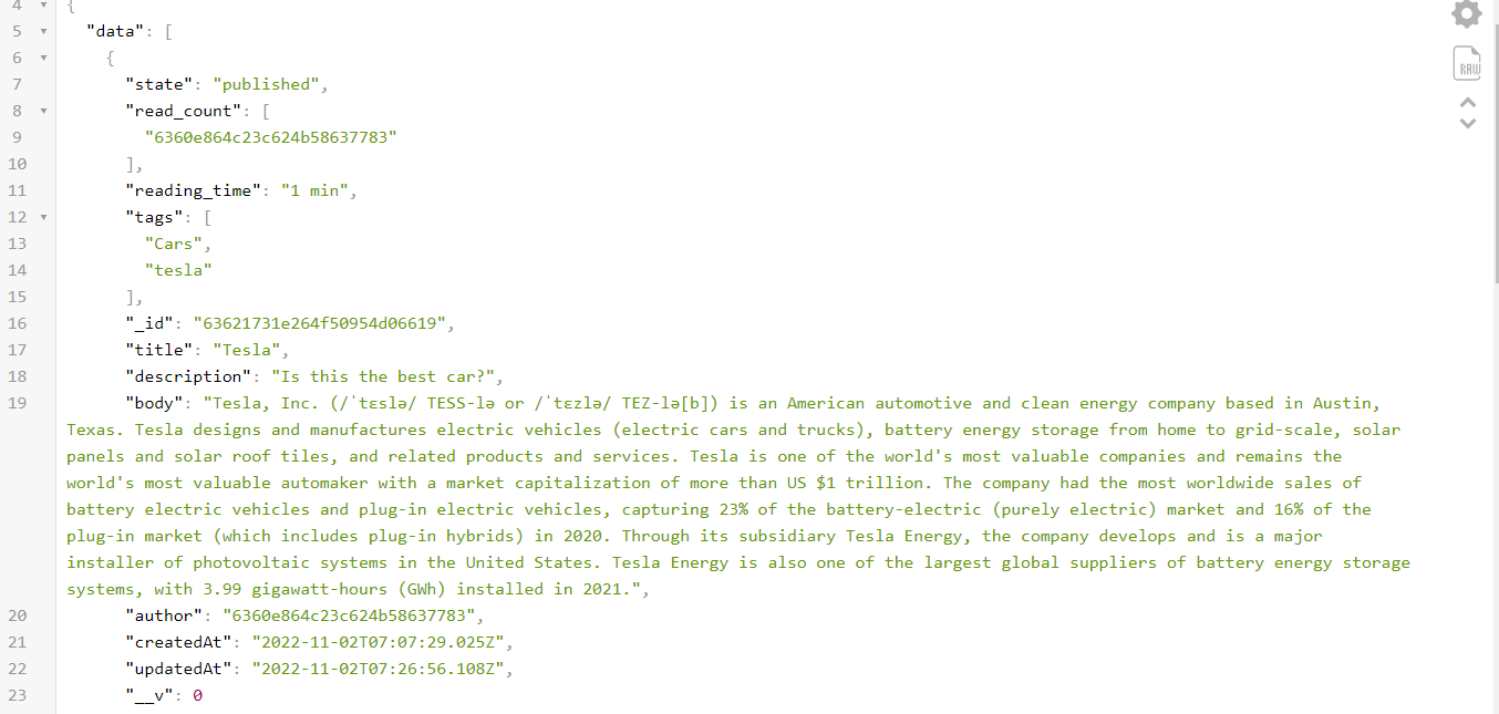 { "title": "Is tesla the best car", "description": "Is this the best car?", "body": "Tesla, Inc. (/ˈtɛslə/ TESS-lə or /ˈtɛzlə/ TEZ-lə[b]) is an American automotive and clean energy company based in Austin, Texas. Tesla designs and manufactures electric vehicles (electric cars and trucks), battery energy storage from home to grid-scale, solar panels and solar roof tiles, and related products and services. Tesla is one of the world's most valuable companies and remains the world's most valuable automaker with a market capitalization of more than US $1 trillion. The company had the most worldwide sales of battery electric vehicles and plug-in electric vehicles, capturing 23% of the battery-electric (purely electric) market and 16% of the plug-in market (which includes plug-in hybrids) in 2020. Through its subsidiary Tesla Energy, the company develops and is a major installer of photovoltaic systems in the United States. Tesla Energy is also one of the largest global suppliers of battery energy storage systems, with 3.99 gigawatt-hours (GWh) installed in 2021.", "tags": ["Cars", "tesla"] }