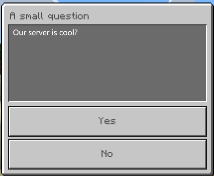 $sender->sendForm(new ModalForm("A small question", "Our server is cool?",