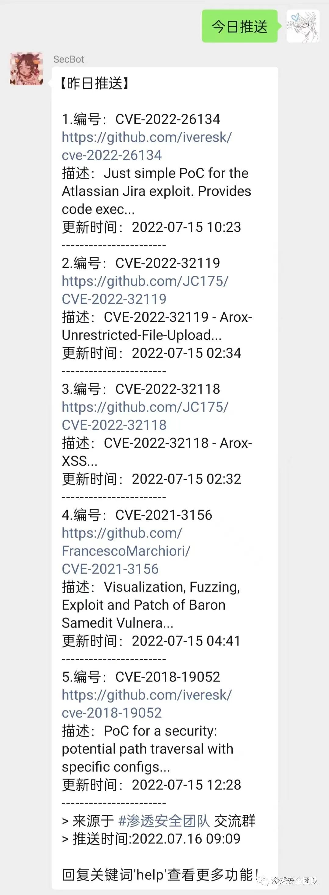 功能③ 回复关键字【今日推送】爬取今日时间到now的漏洞推送! 注:若是今日没有新的exp则更改爬取昨日漏洞推送!