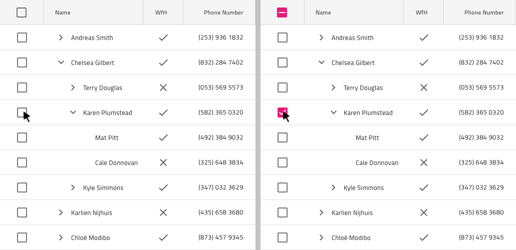 - multiple - when selecting/deselecting a parent row all of its child rows are selected/deselected in a cascading fashion. With multiple selection enabled it is also possible to additionally specify its behavior via the cascadeSelection boolean property which is false by default allowing you to select records one by one as in a flat grid (before selection on the left and after it on the right).