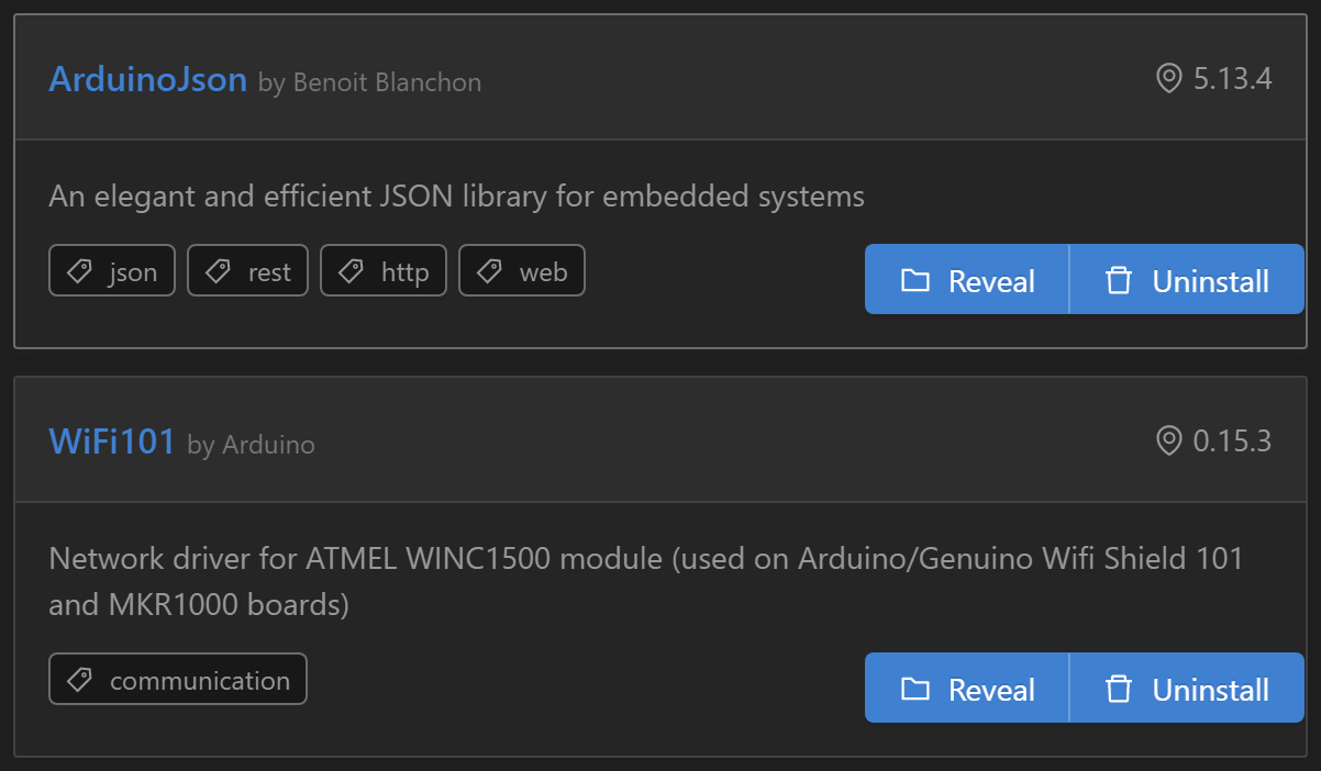 Libraries 메뉴의 Registry 탭에서 ArduinoJson WiFi101 두 라이브러리를 검색하고 설치한다.