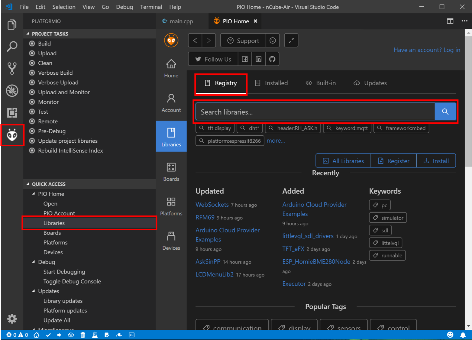 VS Code의 사이드바에 있는 PlatformIO IDE 아이콘을 클릭하고, QUICK ACCESS메뉴의 Libraries메뉴를 클릭한다.