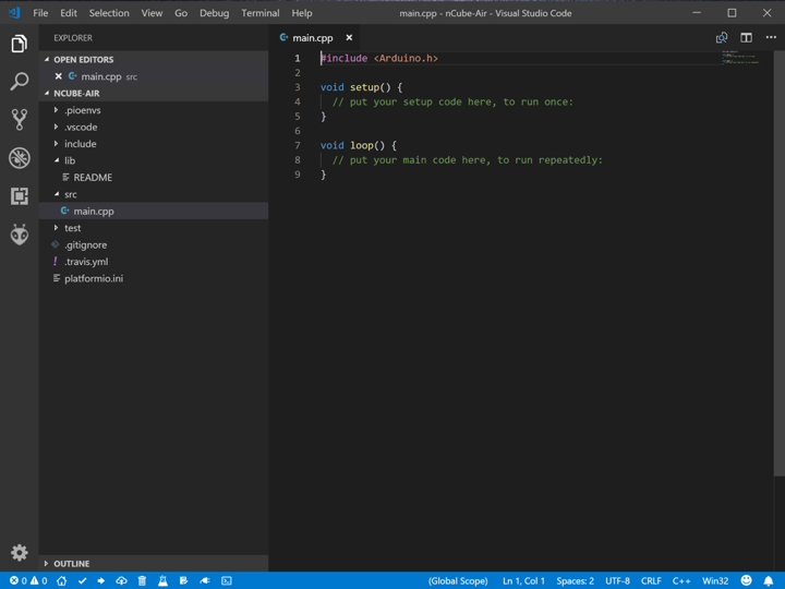 위의 그림과 같이 프로젝트 폴더가 열림을 알 수 있으며, 아두이노를 동작시키는 main.cpp 파일이 src 폴더 아래에 있음을 확인할 수 있다.