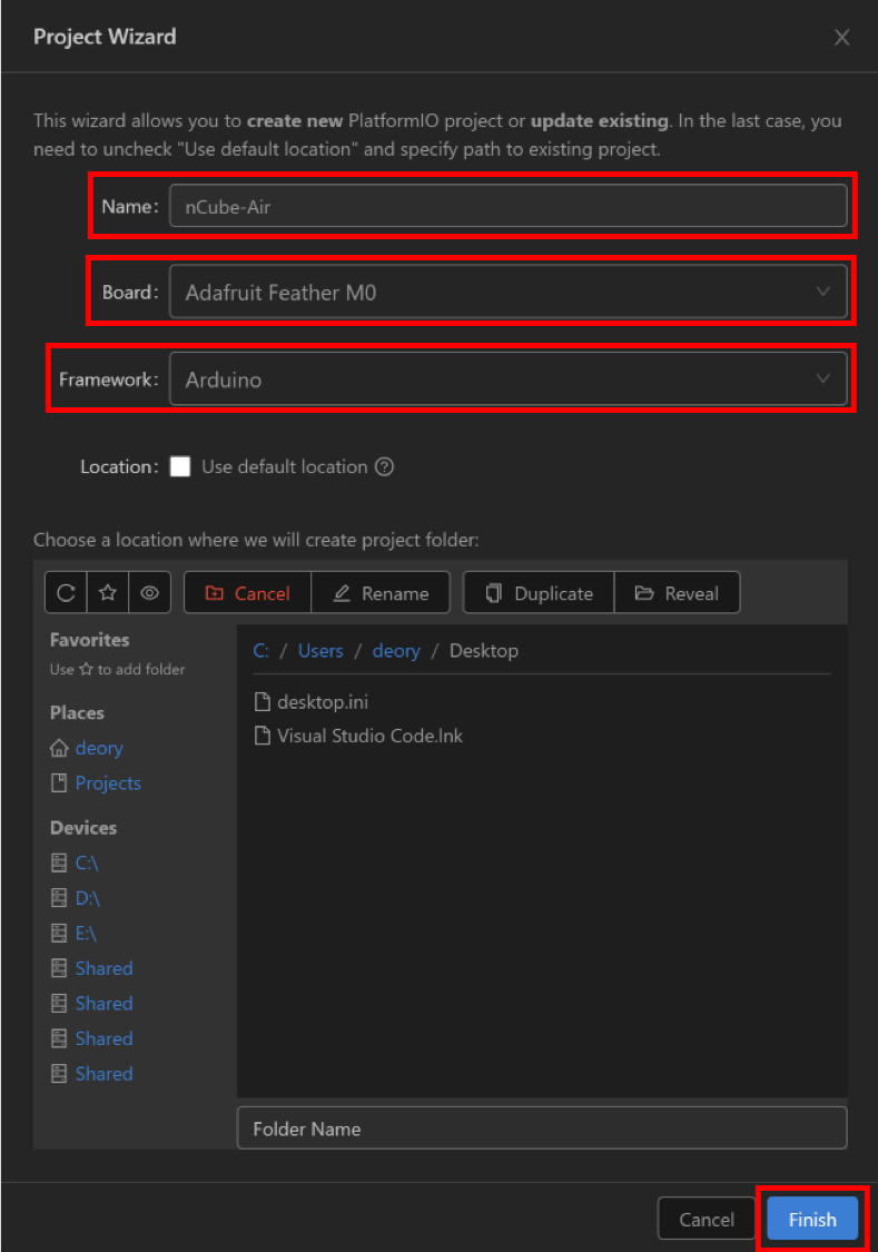 Name에는 원하는 프로젝트 이름을, Board에는 'Adafruit Feather M0'를, Framework에는 Arduino로 설정한 뒤 Finish버튼을 누른다.