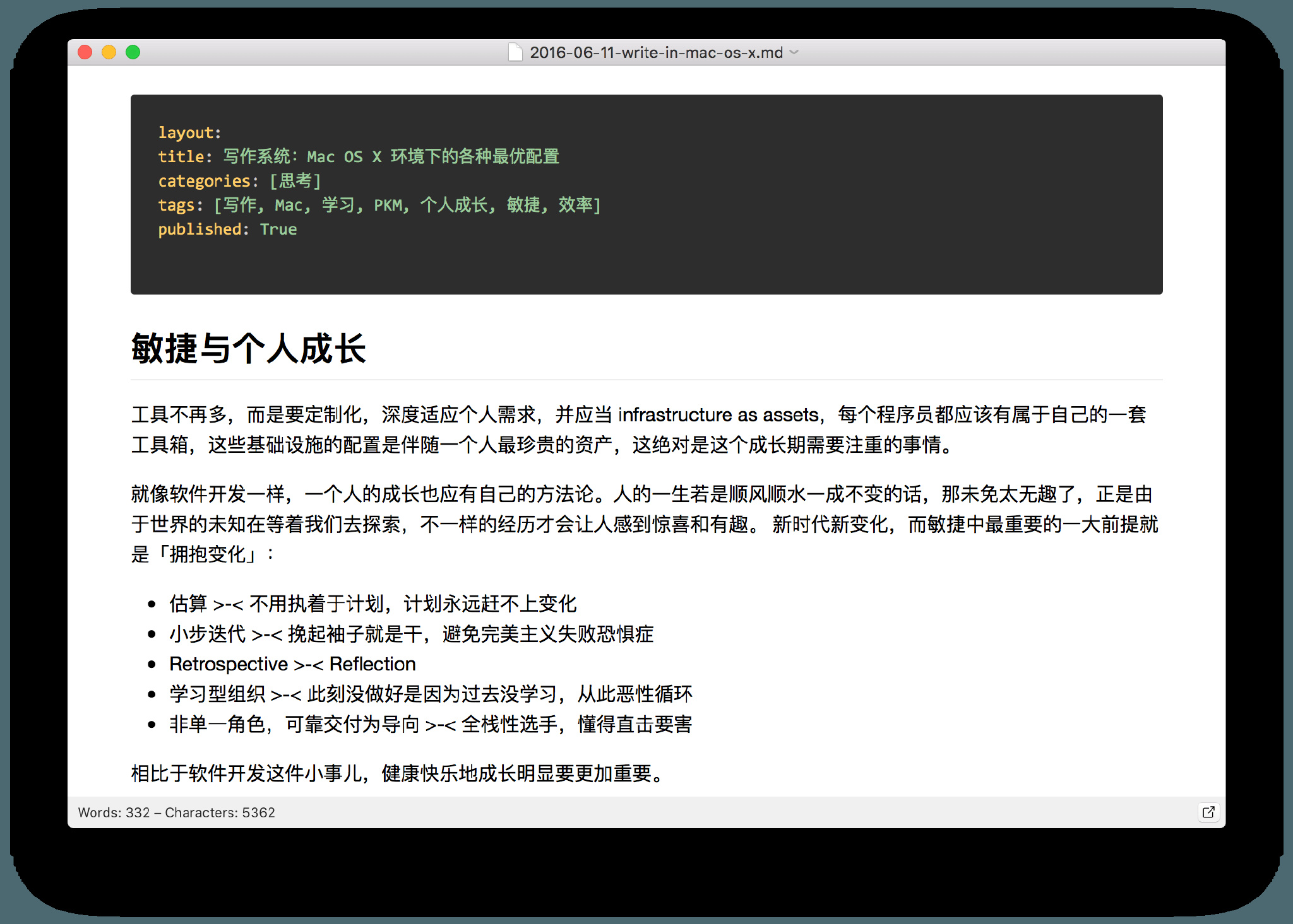 layout: post title: 敏捷写作:macOS 环境下写作系统的最优配置 categories: [思考] tags: [写作, Mac, 学习, PKM, 个人成长, 敏捷, 效率] published: True