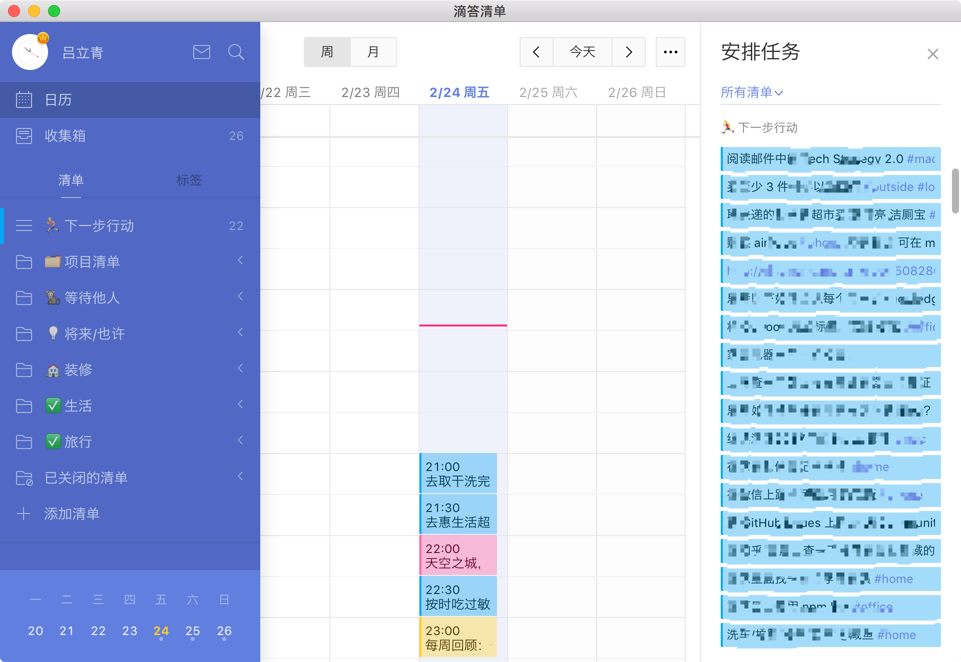 新的一天又开始了,首先映入眼帘(需要关注)的是「日程表」, macOS 端的滴答清单提供了周视图与月视图,iOS 端则提供了更好用的 3 日视图与周视图,进一步验证了不同情境下(#mac 与 #phone)的关注视野应当不同。我们能够看到最近几天会有哪些已被安排的会议(关联 Google Calendar,公司会议一览无余)、以及以前安排好的「今天不做会死」的事情。