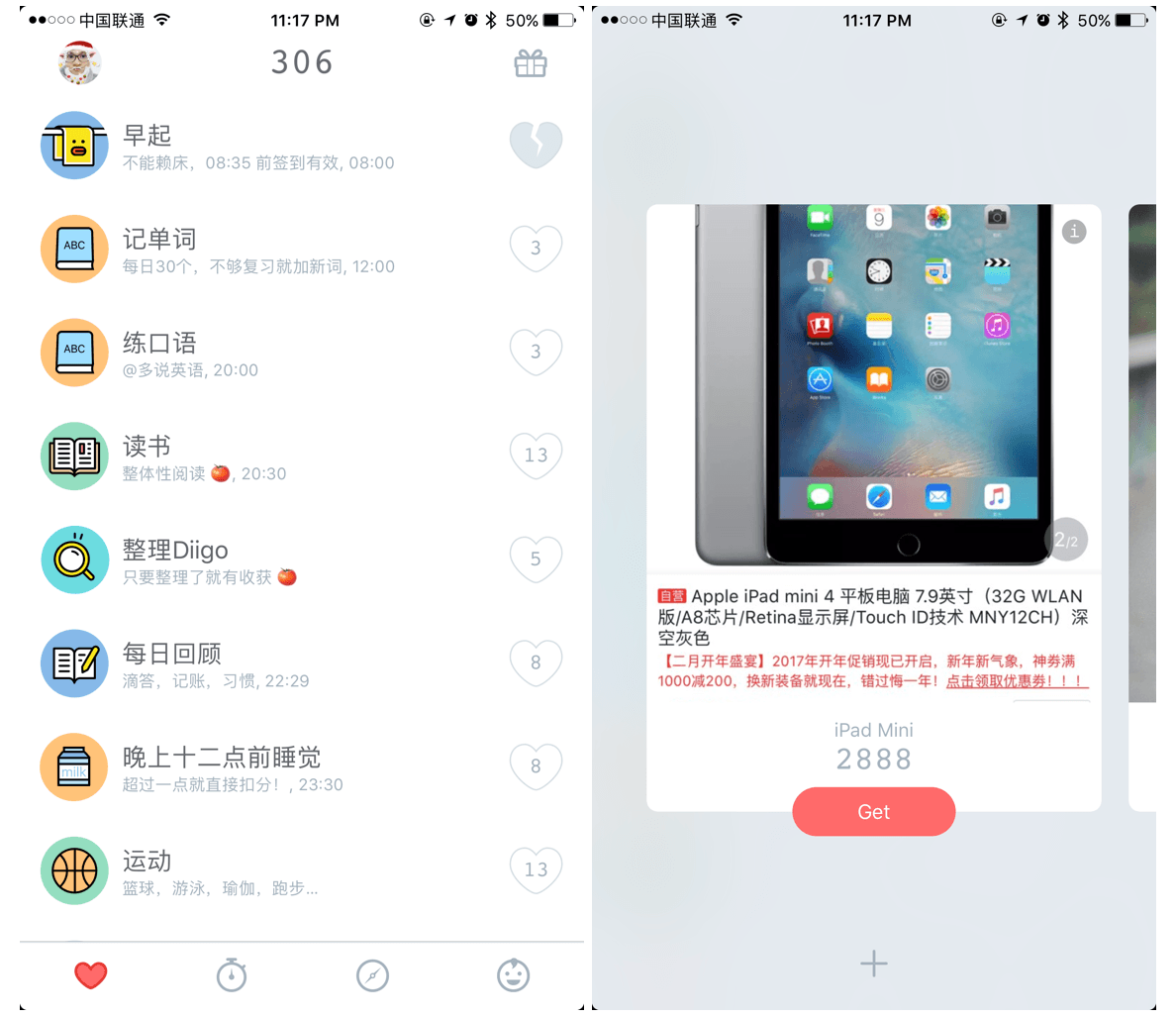 当然,我们也可以设计一套”功利“的奖惩方式,即在 @好样 里面所记录的习惯可以用于积分,比如累计满了 2888 积分过后,便可以给自己奖励一个 iPad mini,用于更方便得看书和阅读,以辅助自己能够更好地坚持下去;或者是玩游戏,需要耗费 100 积分来换取,这时往往就会特心疼而选择犹豫吧,或者事后扣分再后悔也已经来不及了。