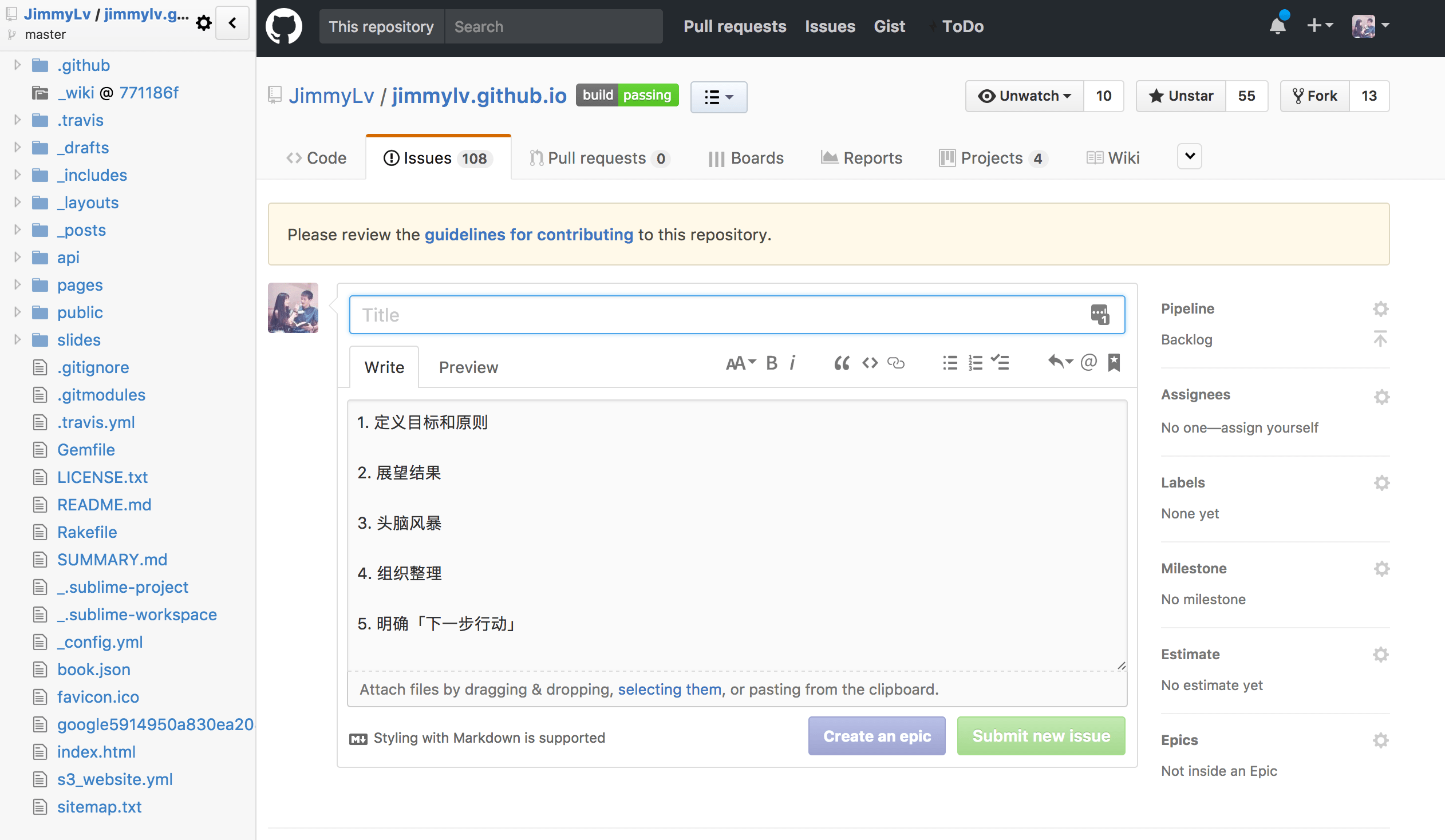 那么既然有了横向就必然会有纵向,而纵向控制则是对每个具体主题或项目进行思考和协调,激发自己大脑的活力,对某个特定事务进行深入的思考和大胆的想象。结合之前所写的基于 GitHub 的敏捷学习方法之道与术一文中所提到的 GitHub Issue 来看,对 Issue 最好的一个定位即是 GTD 当中的「项目」这一 level,所以我将 ISSUE_TEMPLATE 改成了以下内容,堪称对「项目」进行分析的最佳套路: