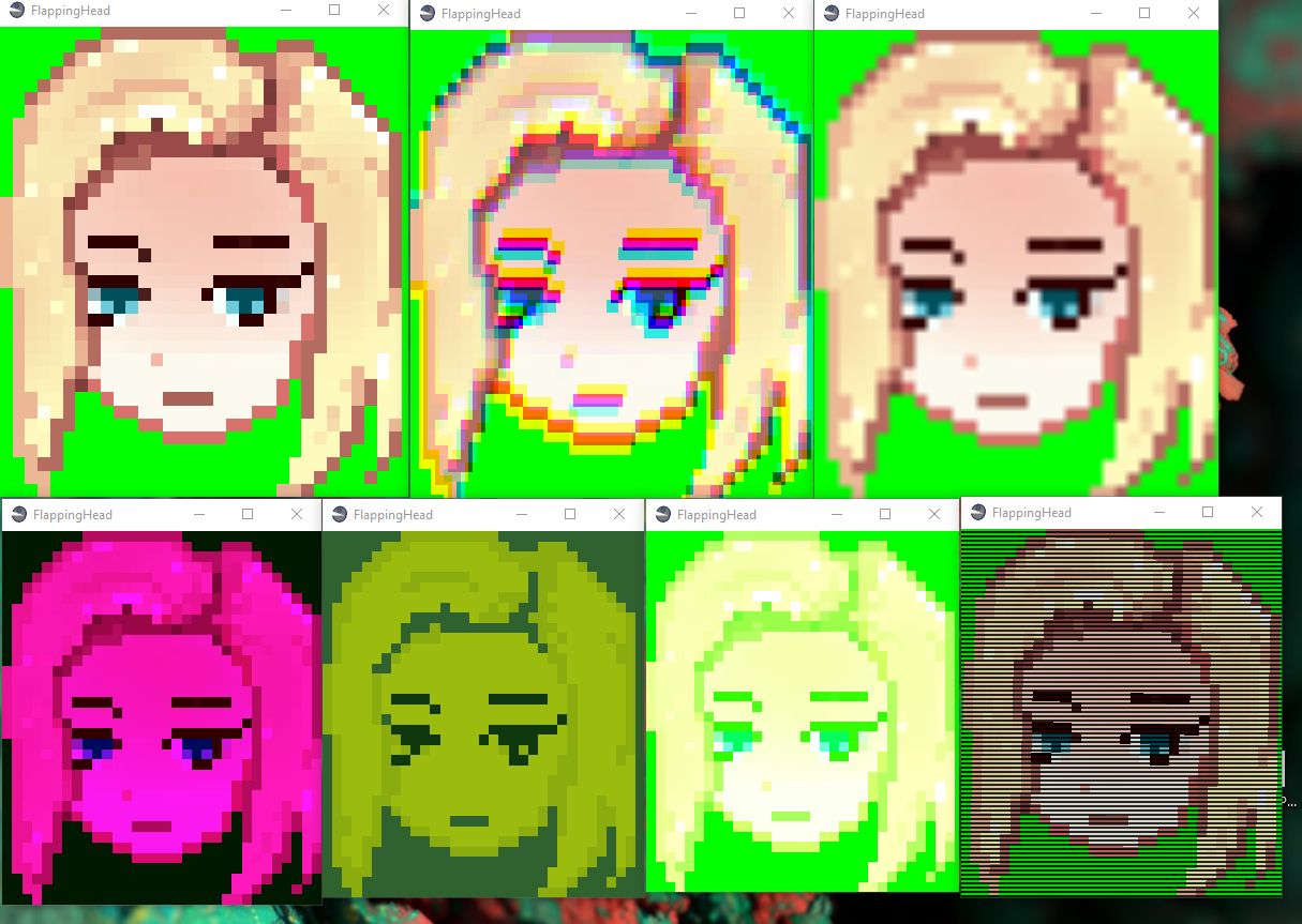 FlappingHead is a voice-activated talking-head program. The program can pick up any mic's current audio and move a mouth (and move the head if there's enough volume coming through) to suit it. At the current stage of development the program is fairly customizeable in that you can use most any art assets to replace the defaults, regardless of size (so long as they fit on the screen). The program has a standard green-screen backdrop for ease of use as an overlay on streams.