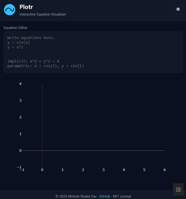 Plotr is a Desmos-inspired interactive graph calculator built with JavaScript, Plotly.js, and math.js.