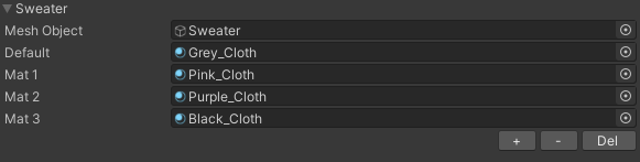 Material categories have a 'Mesh Object' field. This is simply the gameobject that has the mesh renderer/skinned mesh renderer attached with the material that you would like to swap. Default material is the current material that is on the mesh, hence the name default. This is required in order to fetch the proper index of the material position in the materials array of the renderer, as well as used as the default material in toggles (default animator state). Add any materials you would wish to swap with.