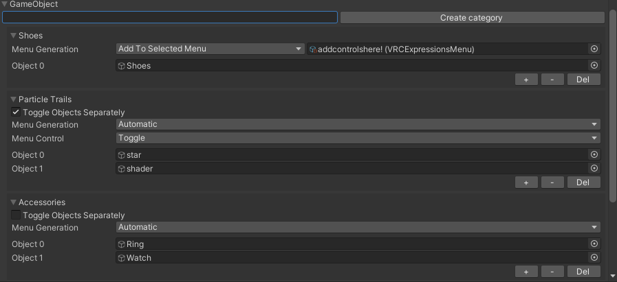 Material categories are for creation of material swap toggles, gameobject categories are for on/off object toggles, and blendshapes categories are for blendshape value toggles/sliders.