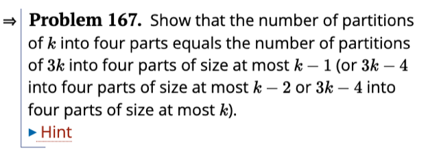 The last part should be “(or 3k + 4 into four parts of size at most k).”, not 3k - 4. Interestingly the solution pdf is free of this typo