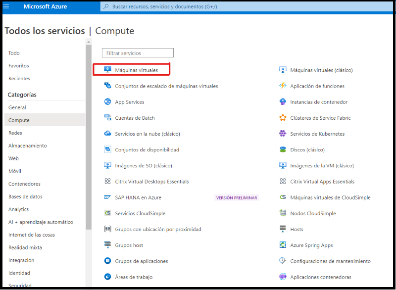 En la sección categorias elegimos 'compute' y dentro de sus servivios encontramos las 'Máquinas virtuales'.