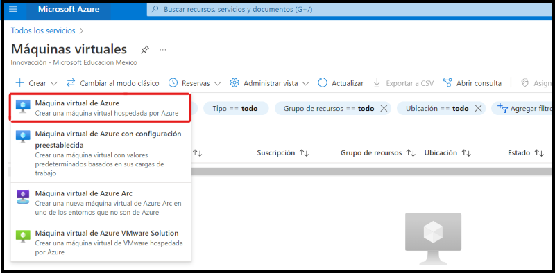 Nos dirigimos a la pestaña 'crear' y dentro de su desplegado de opciones elegimos 'Máquina virtual de Azure'.