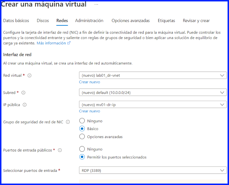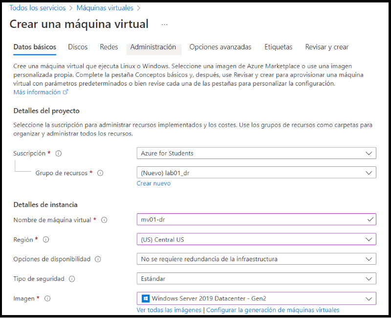 - Creamos un nuevo grupo de recursos, el cual sería un folder donde vamos a guardar nuestra máquina virtual dentro de la nube, lo nombramos como: lab01_dr.