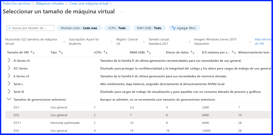- Seleccionamos un tamaño al que tengamos acceso considerando nuestro credito y requerimientos, para eso podemos ir a la pestaña ´ver todos los tamaños' y decidir el que nos convenga, para esta situación me decidí por el 'DS2' que esta dentro de 'Tamaños de generaciones anteriores'.