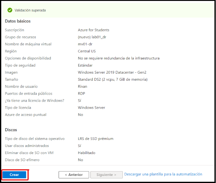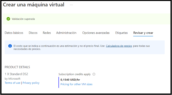 Como su nombre lo dice ya que configuramos las caracteristicas y requerimientos necesarios para nuestra máquina virtual, Azure revisara toda la información y nos creara lo solicitado cuando nos indique 'Validación superada'.
