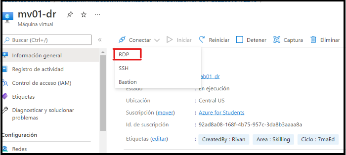 - Exploramos nuestra máquina virtual, para eso presionamos en 'conectar' y despues elegimos 'RDP'.