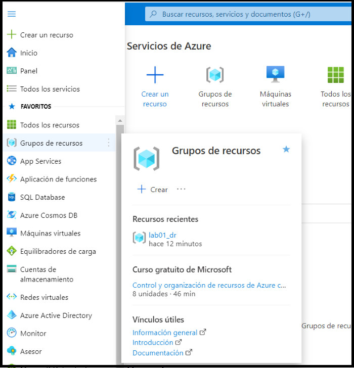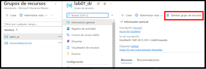 - Seleccionamos 'lab01_dr' y presionamos 'eliminar grupo de recursos'.