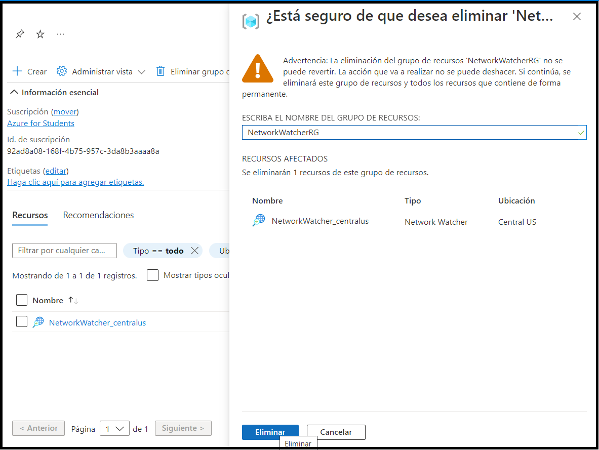 - Por ultimo tambien eliminaremos 'NetworkWatcherRG' el cual se encarga de vigilar la red del grupo de recursos.