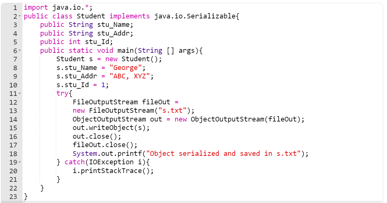 Since you now know what serialization in Java is, and all the relevant points, let’s delve deep into how to serialize an object. You must use the writeObject() method of the ObjectOutputStream class for serialization and readObject() method of the InputObjectStream class for deserialization purpose.