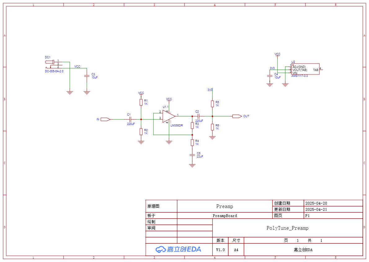 该部分为纯模拟电路,使用了常见的 LM358 运算放大器,对输入的乐器信号(小振幅交流电)放大,并加上 1.65V 的直流偏置。如此处理是受限于 ADC 精度(12-bit)与输入电压范围(0~3.3V)的结果。