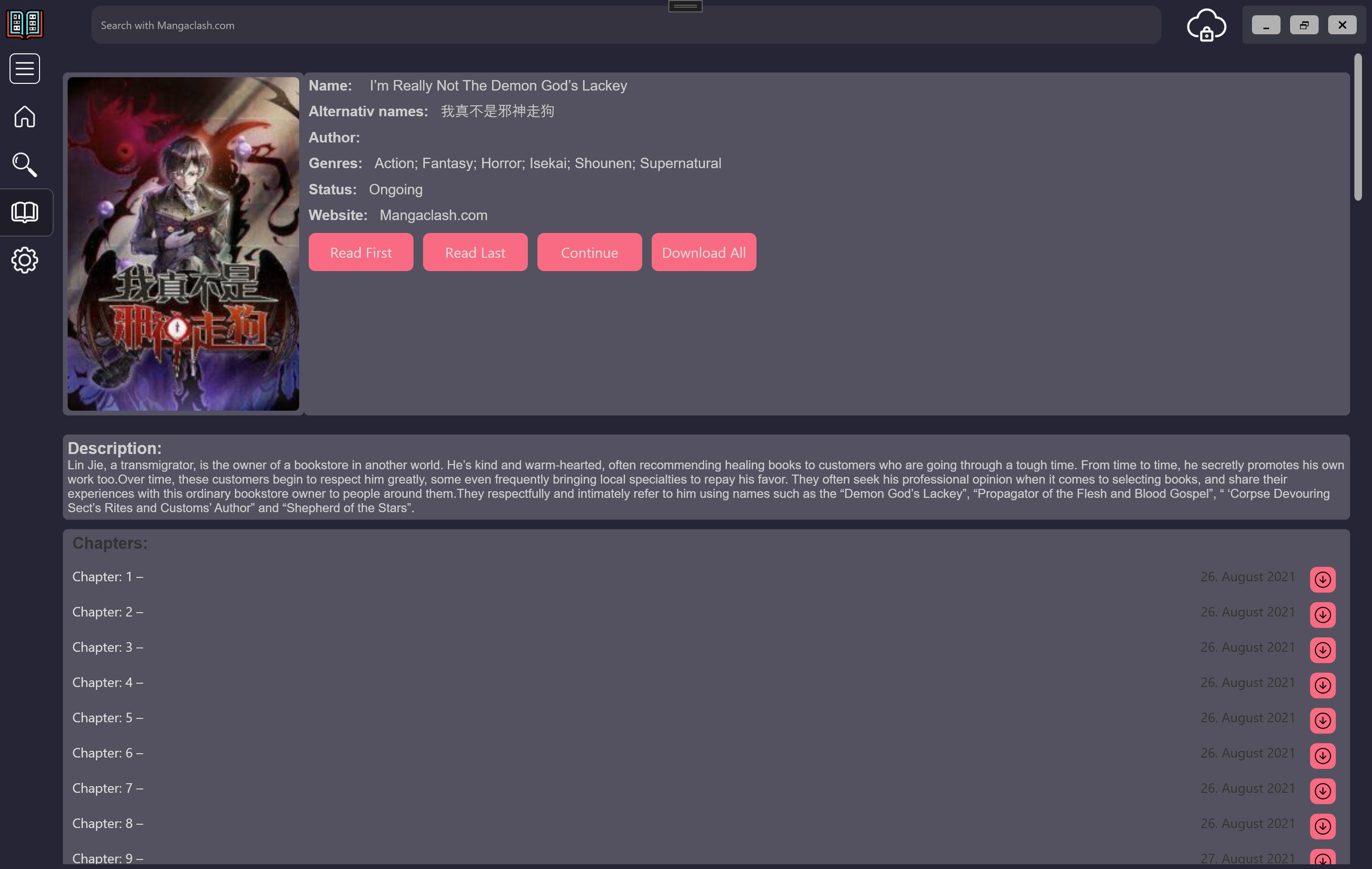 Access detailed information about a comic and download its chapters. To download all images of an manga or comic press download all. To download one chapter press the download button next to the chapter.