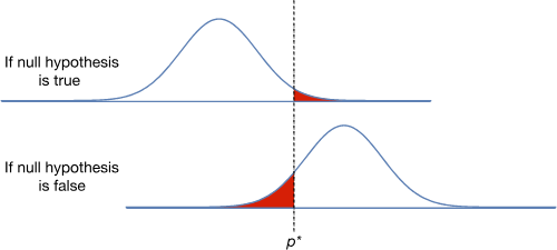En el siguiente diagrama, podemos notar una línea que representa el borde del valor p. Esta es una propción particular en la que tenemos que encontrar para rechazar la H0. Si nuestro experimento produce un valor por encima de p*, debemos de rechazar la H0. Se encontramos un valor por debajo de H0, no debemos de rechazar la H0. En este caso, los errores están marcados en rojo. El primer gráfico es un error de Tipo I y el segundo un error de Tipo II.