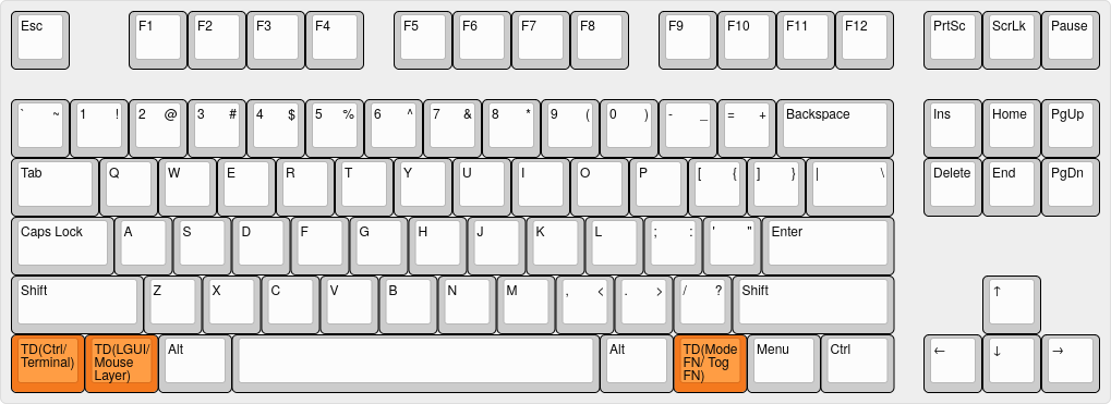 - LCTRL sends LCTRL for single tap and LCTRL+LALT+T for double tap, which opens terminal in most environments.