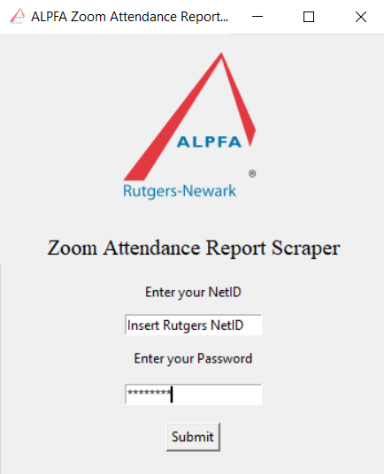 This desktop application is intended for the use of the executive board of the student organization, ALPFA Rutgers-Newark. It is meant to send attendence reports from virtual events that we have conducted via Zoom to validate who attended them. Participation to our events is crucial as it is one of the factors that contributes to our Point System (each student is awareded a specific amount of points if they participate in one of our events, assuming they're there 75% of its duration).