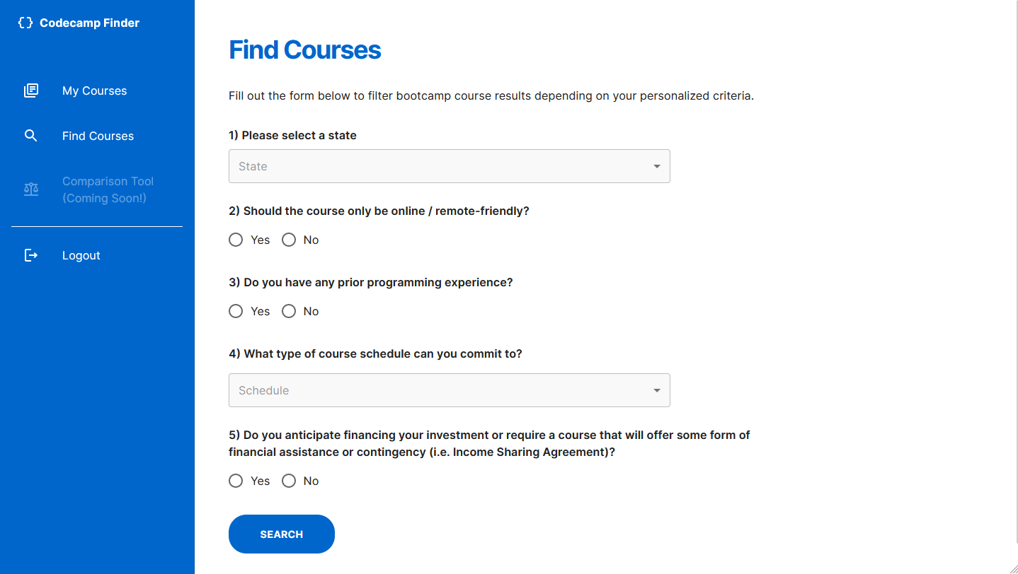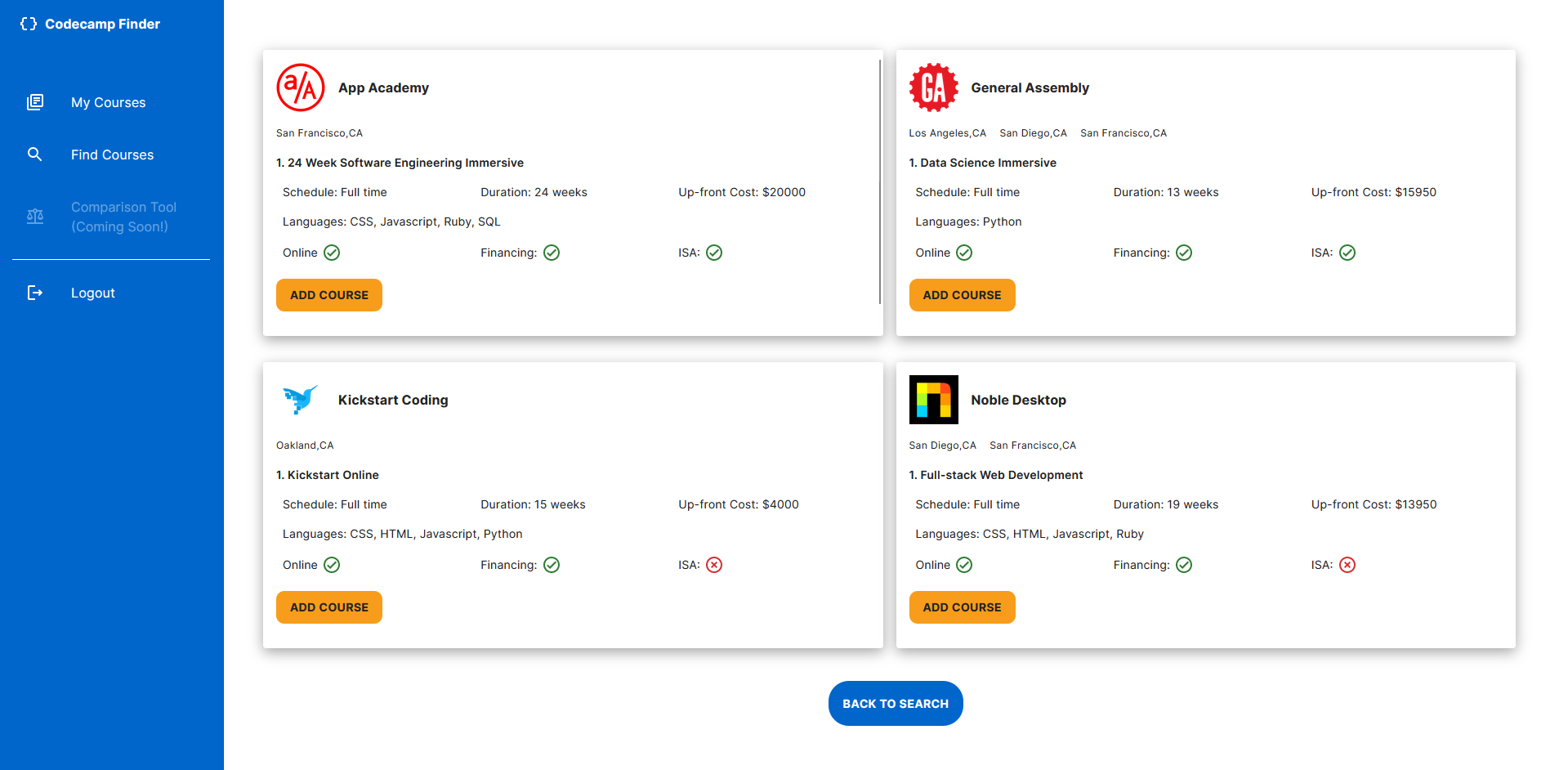 With coding bootcamps on the rise as a potential alternative to break into tech, and with so many options for prospective students looking to delve into an exciting new career, it's hard to decide which institution aligns best with your values and will actually help you achieve your goals. This application was designed to serve as a tool to assist and streamline the process of exploring some of the nation's most popular coding bootcamps and their available courses.