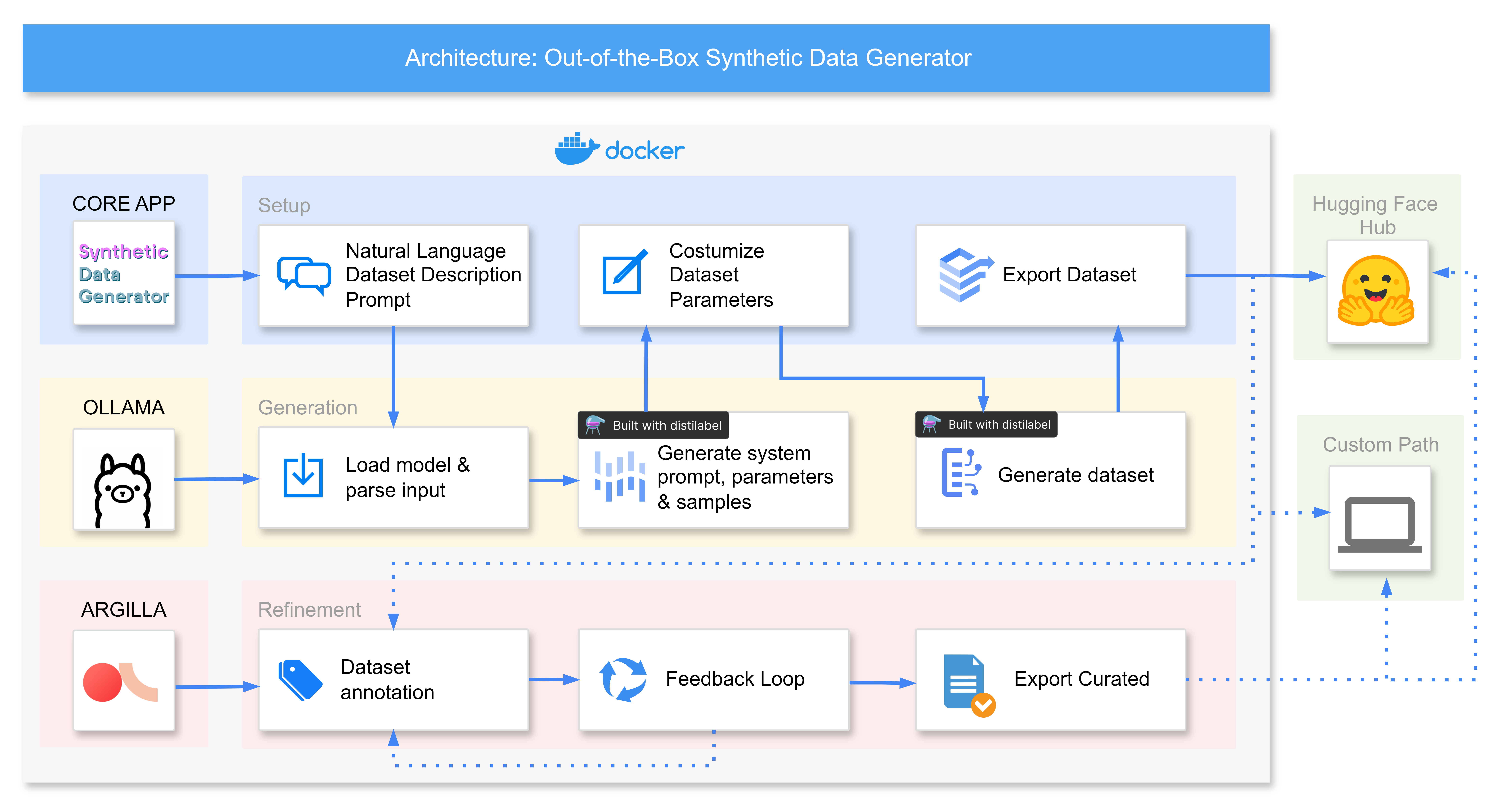 python app.pyThe containerized tool uses Ollama for local LLM inference and Argilla for data curation. Here's the architecture: