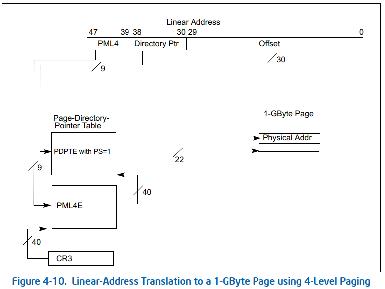 CR4.PAE = CR4.PSE = 0. The translation of a 32-bit linear address then operates as follows:- Bits 31:22 of the linear address select an entry in the guest page directory located at the guest-physical address in CR3. The guest-physical address of the guest page-directory entry (PDE) is translated through EPT to determine the guest PDE’s physical address.