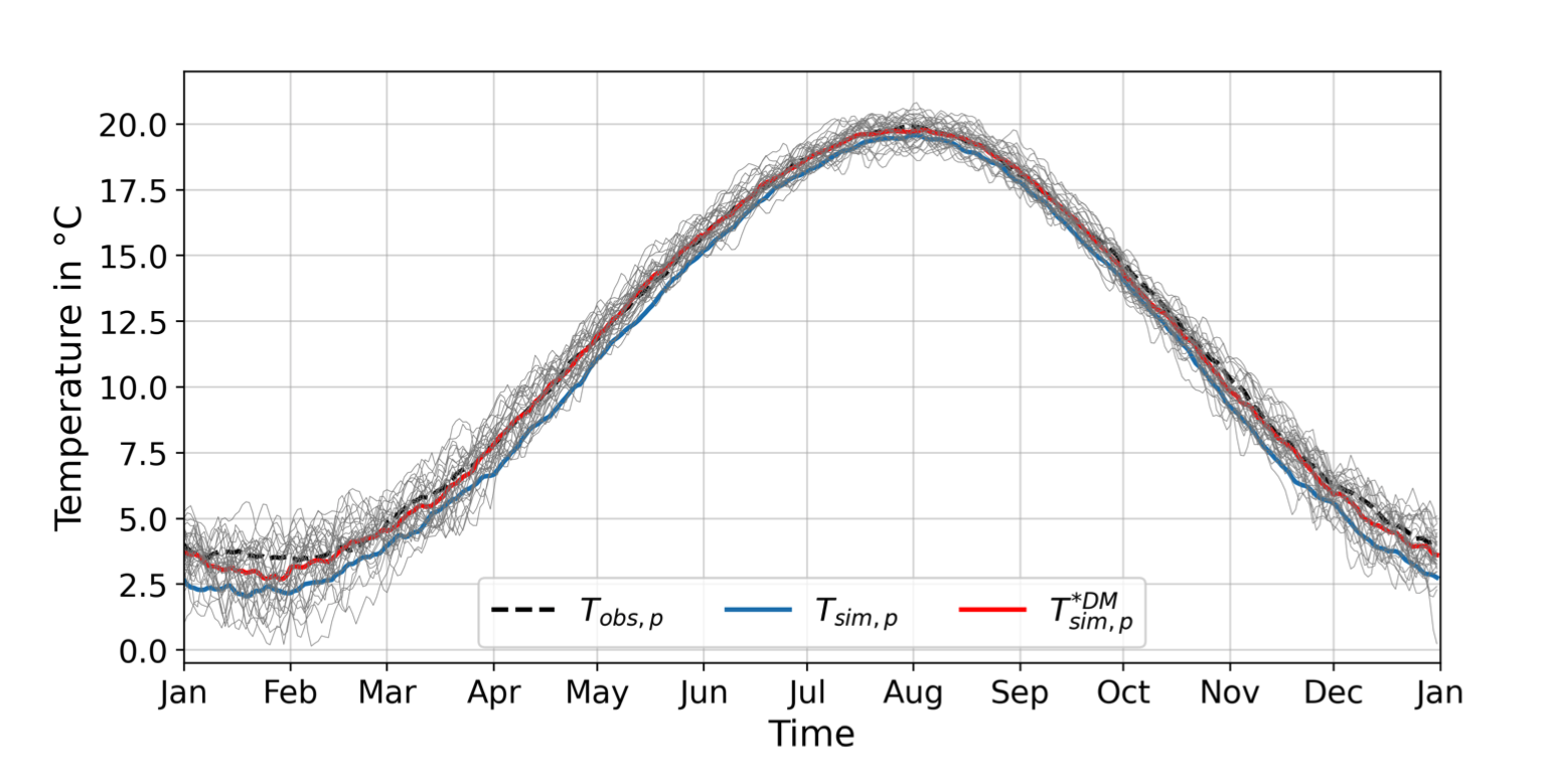 For instance, modeled data can report values that are way colder than the those data reported by reanalysis time-series. To address this issue, an adjustment procedure can be employed. The figure below illustrates the observed, modeled, and adjusted values, revealing that the delta-adjusted time series ($T^{*DM}{sim,p}$) is significantly more similar to the observational data ($T{obs,p}$) than the raw model output ($T{sim,p}$).