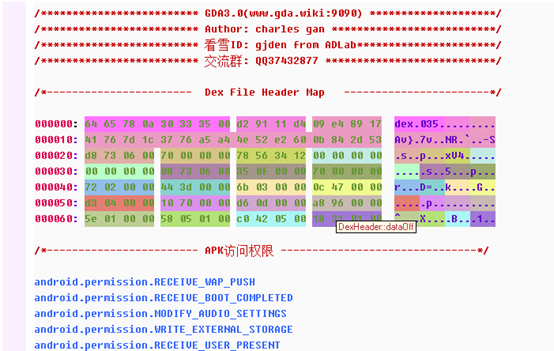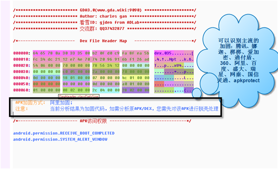 If the APP is reinforced(protected), the GDA will automatically identify the reinforcement and display between the Dex header and the APK permissions, as shown in fig:
