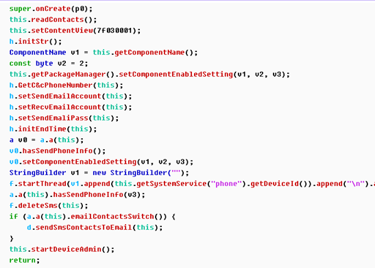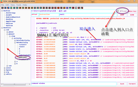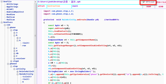 Detailed analysis is a comprehensive analysis for the malicious software execution logic and implementation process, the following brief introduction to the basic usage of GDA. click OPTLoad to enter the execution entry function of APK, and the onCreate function of MainActivity is the first execution function of the APK.
