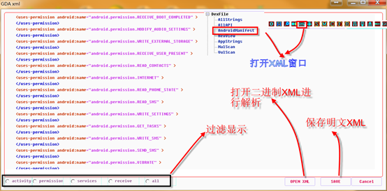 4.Next, you can analyze the Activity, Service, receive and so on through the “AndroidManifest” in the tree frame.