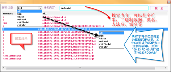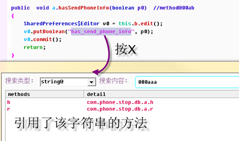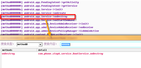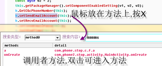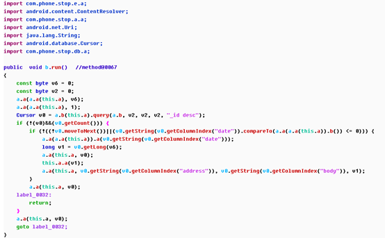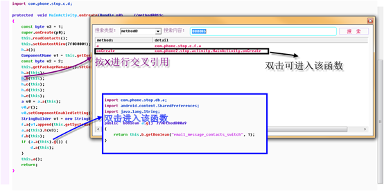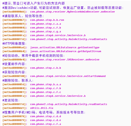 It can be seen that the malware has a lot of malicious manipulation. The list following Behavior description is the method of generating malicious behavior of this type. Double click method@ to access this method,For example, click enter the second description ” #读取联系人、短信等信息:” And [method@000067]: com.phone.stop.b.b.run