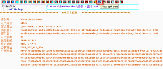 - We see the signature information of the APK through clicking the toolbar that follows the red markup.