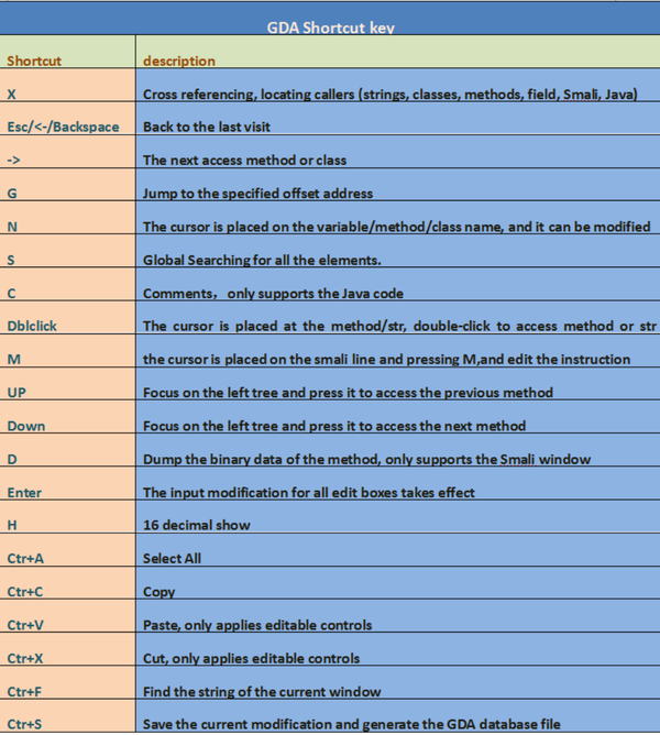 This tool provides many useful sub-tools, such as check shell(protection software), ODEX to DEX, Oat to DEX, XML binary parser, algorithm tool, Android device memory dump and so on. In the interactive analysis, provides a string, method, and domain cross references query, function query, the caller query, comments, and analysis results saving, and so on. I rewritten all Decompiler code basing on Decompiling theory for GDA3, And the disassembly engine, data flow analysis, interlingua optimization, structured analysis and so on,they have all made significant changes.And I also optimized the DEX parsing engine, malicious behavior detection engine, checking shell engine, compared with GDA1 and GDA2, The speed, stability and experience of the analysis are all great improvement and upgrading.