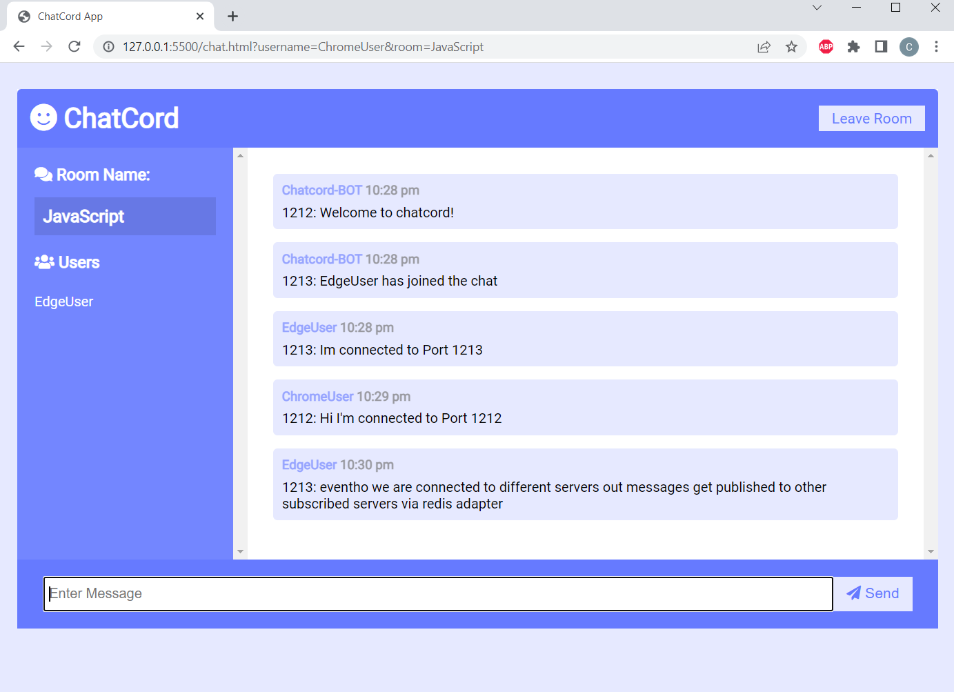 Now Server 1 will be started on PORT=1212 and Server 2 on PORT=1213 and the Client on PORT=5500. Two servers will be load balanced using nginx on PORT=80 so the client will be directed to either Server 1 or 2 when it hits Port 80. Hash based load balancing is enabled (to achieve stickiness) since nginx open source doesn't allow cookie based load balancing. Go to http://127.0.0.1:5500/ with 2 browsers (Edge and Chrome for example) then the 2 instances will be connected to Server 1 and 2 respectively.