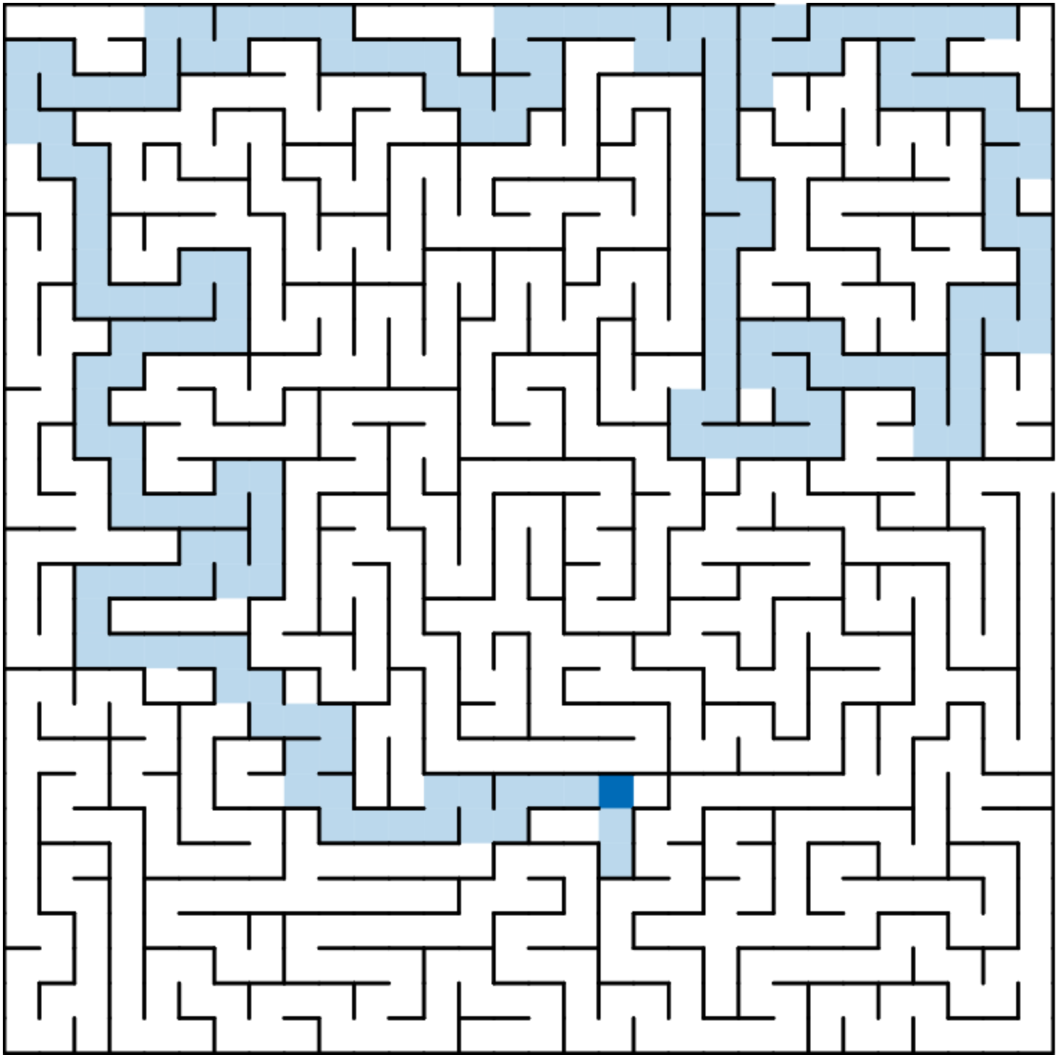 The generator can either create mazes instantly, or slow down the process so that you can watch the algorithms at work. Some algorithms work using a process of trial and error, and can take a long time to finish, whereas others are guaranteed to complete quickly: