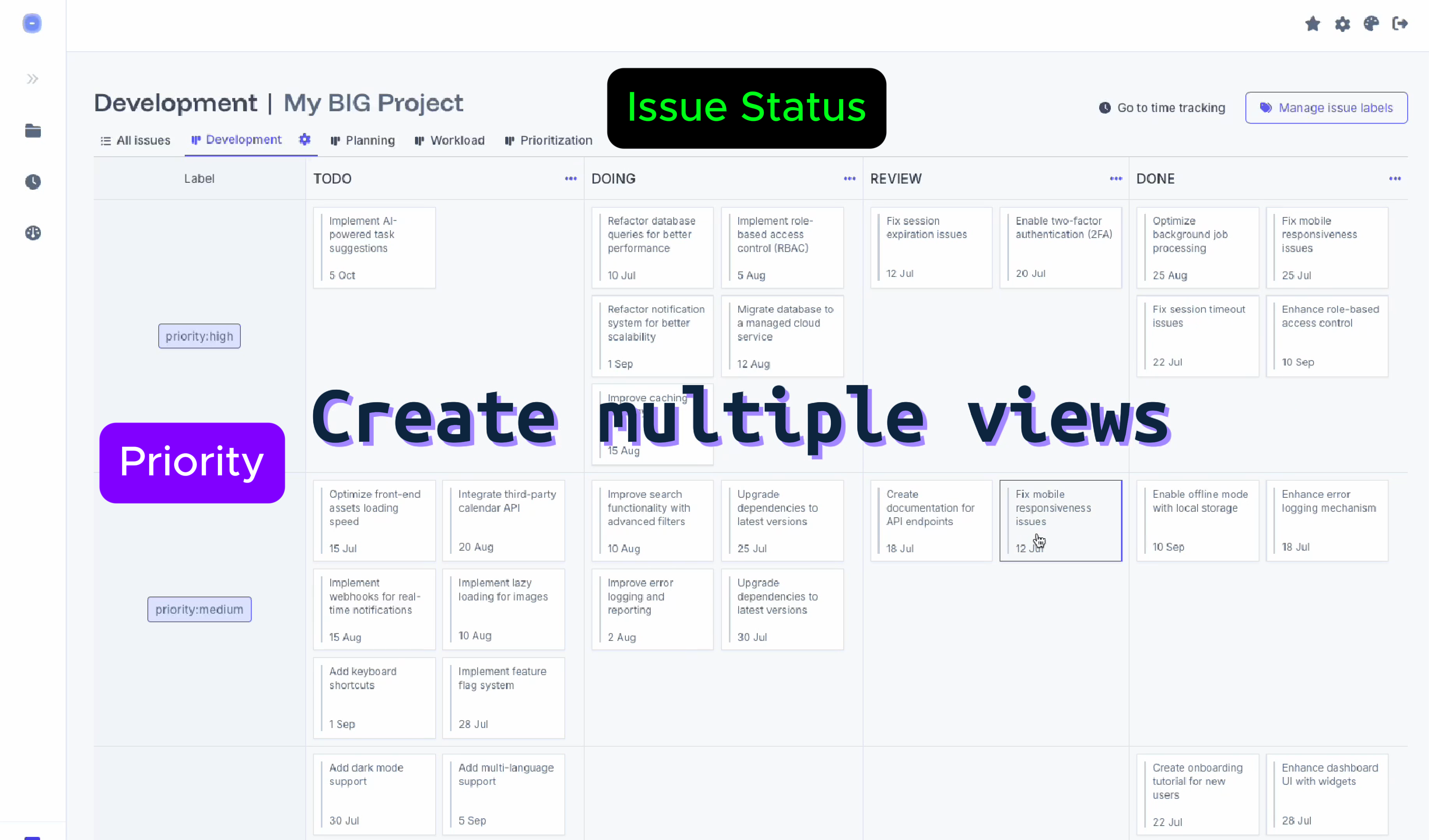 - Issue Labels and Shortcuts: Organize your issues and workflow with labels