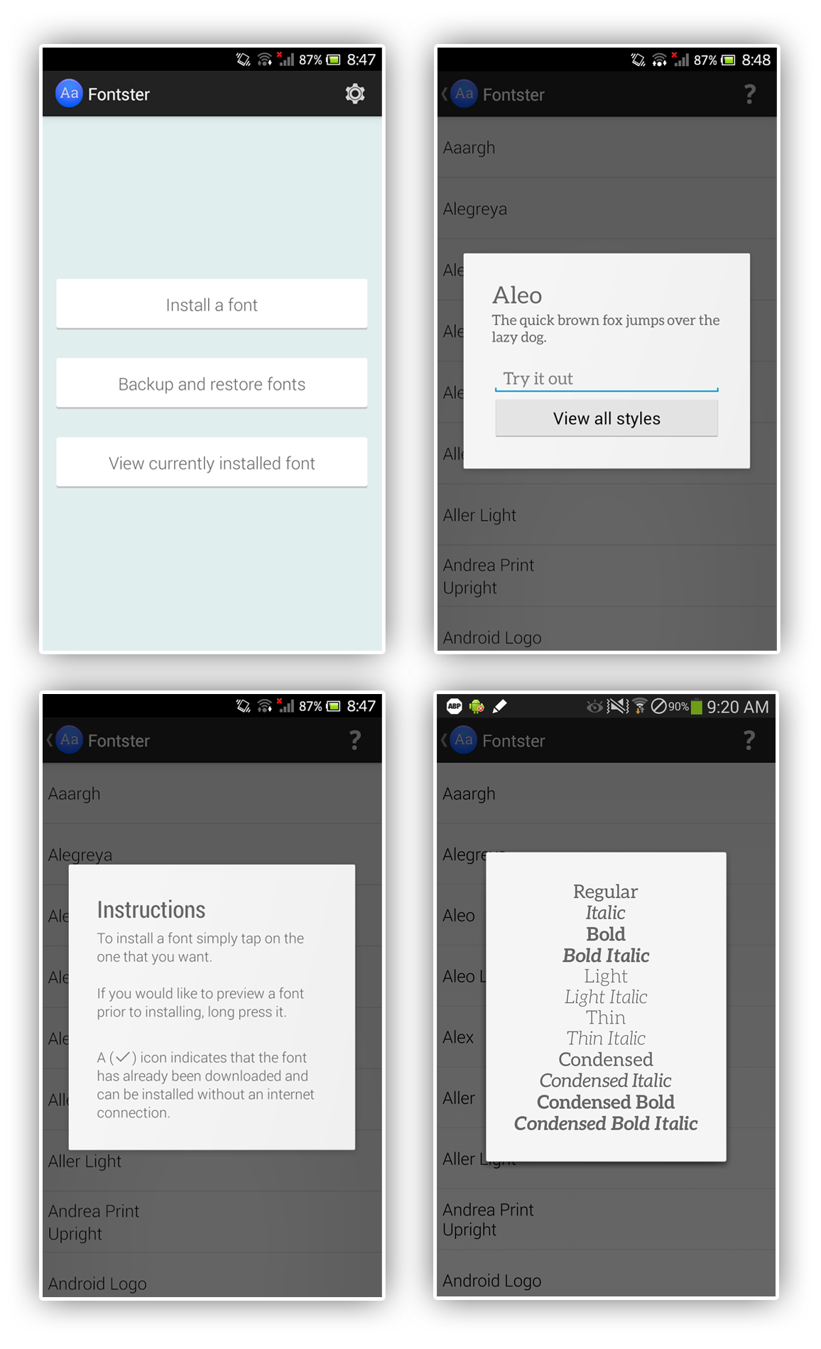 We will be creating an Android app that allows users to pick from a large selection of custom fonts, and then install the one of their choice as the system typeface. In other words we will be developing a font installer app for Android. Other functionalities of the app include font previewing, backup and restore fonts, and view currently installed font. The app requires that your device is rooted (necessary in order to write new fonts into the system partition), and that it is running Android Ice Cream Sandwich or higher (Android 4.0+). In addition it is recommended that your device has at least 512MB of RAM, and a single core 1GHz processor or better. Sufficient storage space is also essential for the downloaded fonts to reside. The app will need access to the following permissions: