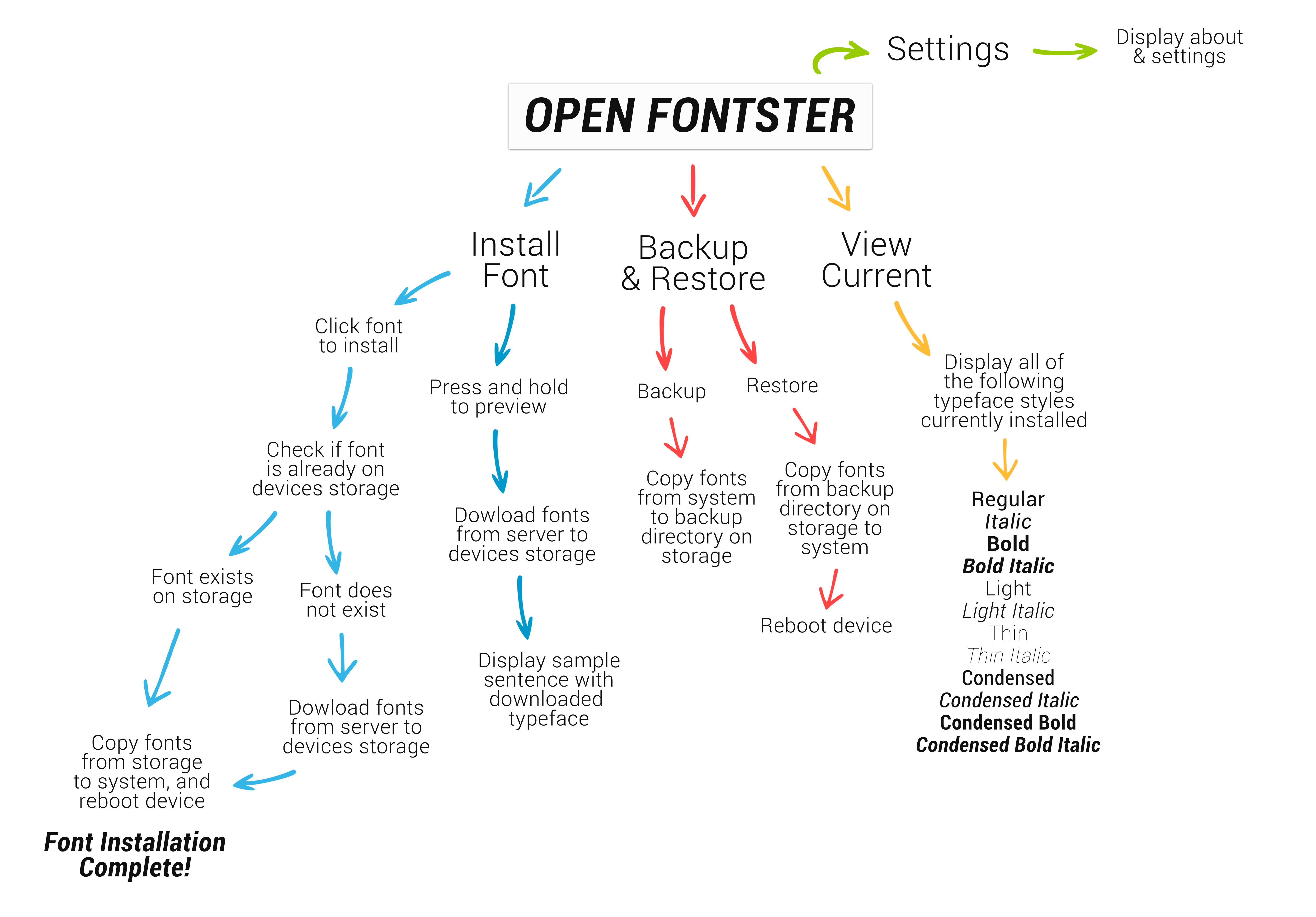 - Full permissions to all device features and storage (root access needed to push fonts into system)