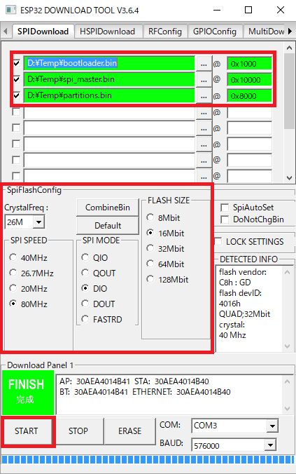 python esptool.py --chip esp32 --port <your usb device> --baud 921600 --before default_reset --after hard_reset write_flash -z --flash_mode dio --flash_freq 80m --flash_size detect 0x1000 bootloader.bin 0x10000 spi_master.bin 0x8000 partitions.bin